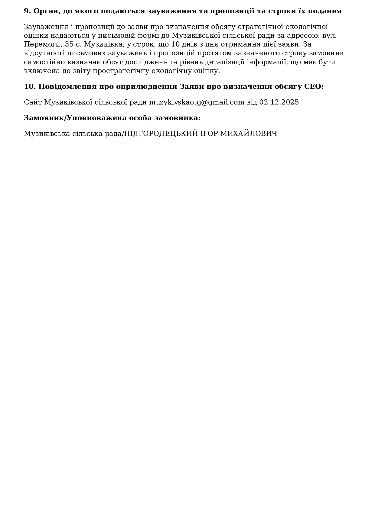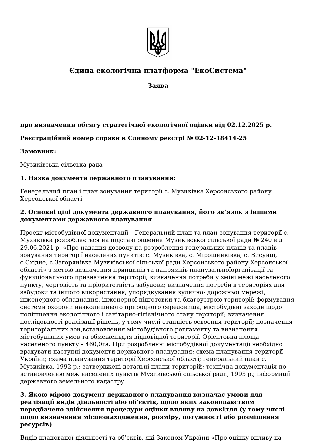 Заява про визначення обсягу стратегічної екологічної оцінки генерального плану території с.Музиківка Музиківської територіальної громади Херсонського району Херсонської області